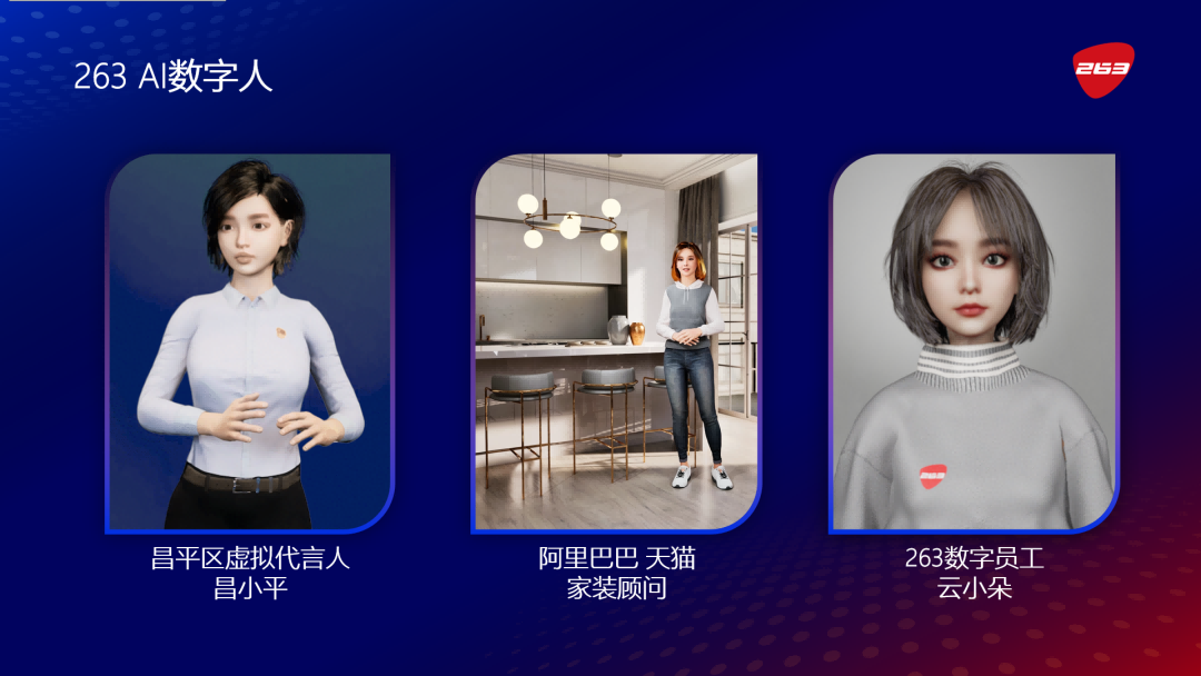 263數字人可依據不同的應用場景承擔對應的工作職能,降低人工服務成本。目前,263數字員工“云小朵”和263與北京市昌平區經信局共同打造的昌平區虛擬代言人“昌小平”已經能很好地完成行業大會主持、智能客服對話、主題演講等服務和任務,未來還將有服務于黨建、金融等行業的AI數字人完成交付。