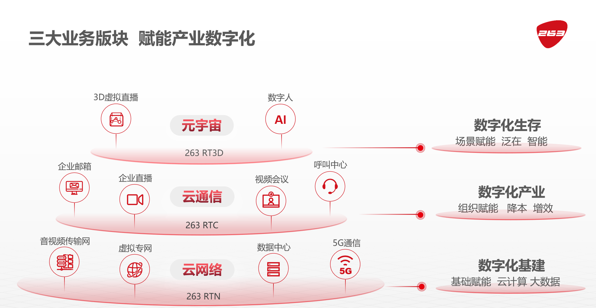 隨著數字化轉型步入深水區,263認為企業需要的不再是數字技術的單點應用,而是服務商深度參與到企業數字化轉型中,實現技術產品的相互賦能,完成數字技術與多業務場景的深度結合。基于此觀點,263以“云網絡、云通信、元宇宙”三大業務為基礎,為企業打造全面數字化能力體系,助力企業由內而外、全方位、深層次的轉型升級。